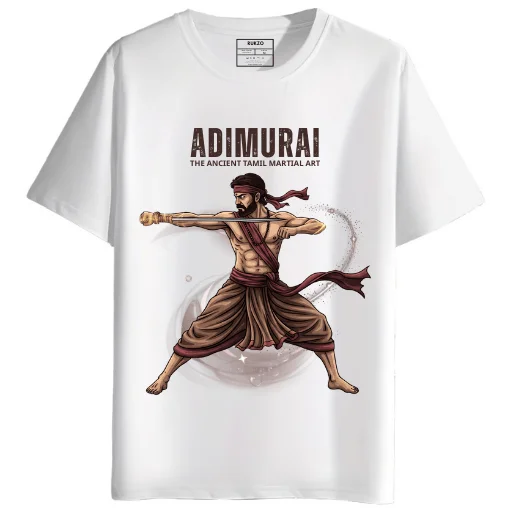 Pay homage to the ancient and powerful art of Adimurai, the traditional martial art of the Tamil people, with our RUKZO “Adimurai” round neck half sleeves graphic printed T-Shirt. This tee is a tribute to the discipline, strength, and rich cultural heritage of a true warrior’s practice. Crafted from 100% premium cotton and a comfortable 180 GSM fabric, it feels as authentic and resilient as the art form itself. The bio-wash treatment ensures a soft, smooth finish and lasting quality, making it a perfect piece for practitioners and admirers alike.