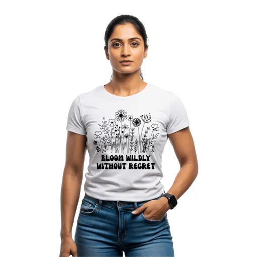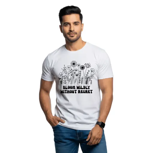 Live your life in full color. Our “Bloom Wildly Without Regret” Round Neck Half Sleeves Printed T-Shirt is for those who aren’t afraid to shine.