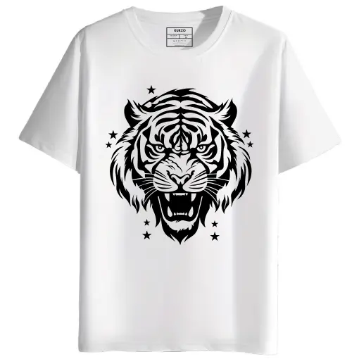 Make a bold, artistic statement with the RUKZO “Fierce Tiger” round neck half sleeves graphic printed T-Shirt. This unique tee combines a striking, detailed illustration with superior comfort and quality.