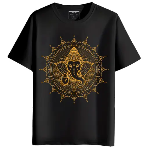 Wear the Divine Blessing of Lord Ganesha, the remover of obstacles and the god of new beginnings, with our RUKZO “Lord Ganesha Mandala” round neck half sleeves graphic Printed T-Shirt. This design beautifully combines the sacred imagery of Ganesha with the intricate patterns of a mandala, symbolizing the universe and spiritual journey. Crafted from 100% premium cotton and a comfortable 180 GSM fabric, it feels as pure and serene as a moment of prayer. The bio-wash treatment ensures a soft, luxurious finish and lasting quality, making this a perfect piece for anyone seeking blessings, wisdom, and peace.