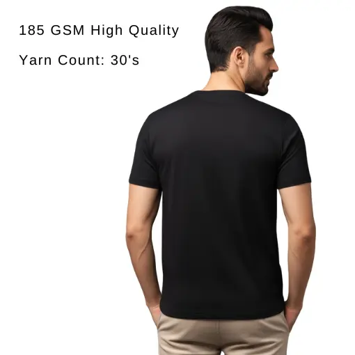 Our 185 GSM fabric provides a substantial, yet incredibly soft feel, while the 2X Bio wash Gold finish ensures a smooth, luxurious texture from the first wear. Designed with Mayer & Cie (German tech Knit) and colored with HI Q+ dyes, this black t-shirt resists fading, pilling, and wrinkling, guaranteeing a lasting, premium look.