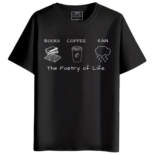 Embrace the cozy, contemplative moments with the RUKZO “Books, Coffee & Rain – The Poetry of Life” Round Neck Half Sleeve graphic printed T-shirt. This tee is more than just clothing; it’s a tribute to the simple, perfect joys that make life beautiful. Crafted for those who find peace in a quiet afternoon, this shirt blends a thoughtful, poetic message with ultimate comfort and style. Made from 100% pure cotton and bio-washed for an incredibly soft feel, just like your favorite quiet corner. A relaxed fit, ultra-soft cotton T-Shirt designed for everyday comfort and timeless expression. The durable 180 GSM fabric ensures it holds up to everyday wear while remaining effortlessly comfortable. The timeless round neck and half-sleeve design make it a versatile piece for your daily streetwear wardrobe.