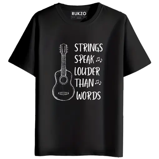 RUKZO graphic t-shirt, Strings Speak Louder Than Words shirt, music quote t-shirt, minimalist musician apparel, Guitarist graphic tee, acoustic guitar t-shirt, electric guitar player shirt, Music enthusiast clothing, musician lifestyle wear, band-style graphic tee, Gift for guitar players, Unique music quote t-shirts for men and women, Premium cotton graphic tee for musicians, Strings Speak Louder Than Words unisex streetwear