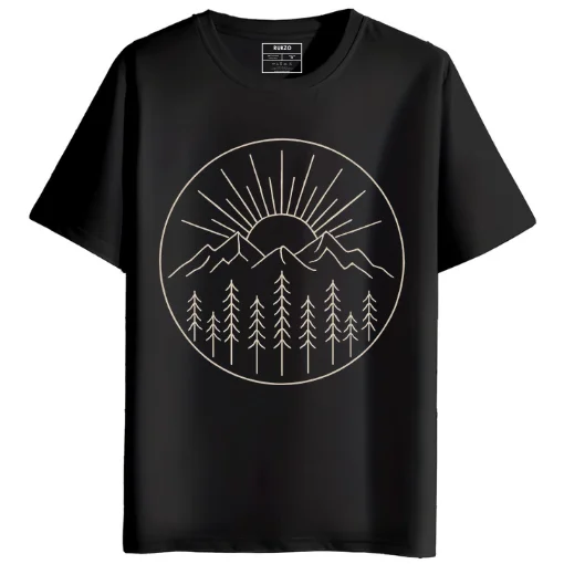Bring a piece of the great outdoors into your wardrobe with the RUKZO Sunrise Over The Pines Round Neck half Sleeves Printed T-Shirt. This unique tee combines a stunning, scenic design with superior comfort and quality. Made from 100% pure cotton with a substantial 180 GSM weight, it offers a great feel and excellent drape. The special bio-wash process enhances its softness and ensures long-lasting wear, making it a staple for anyone who appreciates natural beauty and a well-designed aesthetic.